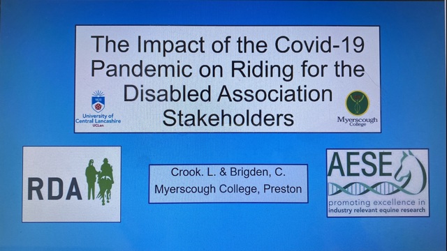 BA (Hons) graduate Leah Crook presented her findings into the impacts of Covid-Lockdown on stakeholders of the Riding for the Disabled Association. This project was conducted with the kind support of the RDA, who shared their survey data with Leah for further analysis.