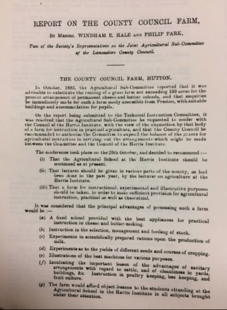 In November, 1893, Lancashire County Council’s Technical Instruction Committee issued a report that stated the desire to ‘’acquire farmland in the Preston area for the specific purpose of technical training in both practical and theoretical agriculture.’’ In 1890, the Local Taxation Act was passed, meaning publicans having to pay customs & excise duty on the alcohol they sold, to be used to pay for education. This tax became known as ‘whiskey money’. In the previous year, the Technical Instruction Act came into force, and county councils now used this levy to fund institutions providing ‘technical’ training.