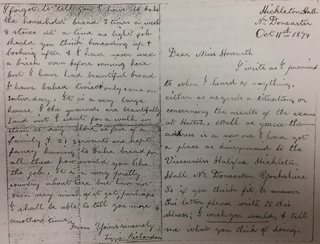 (Above - A letter from Lizzie Richardson, one of the first ever students at the Lancashire County Institute of Agriculture, written in October 1894)