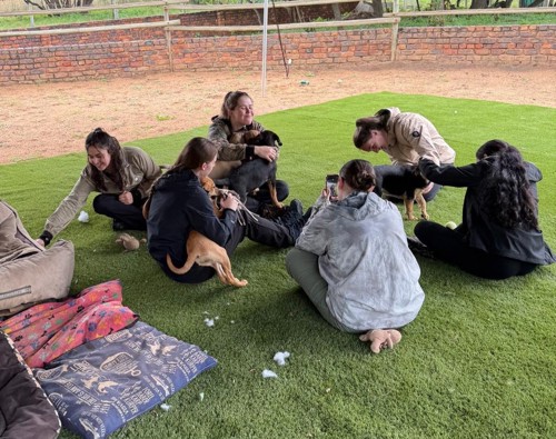 The group visited the Dogs Trust ZA and helped with the husbandry of their rescued animals, cleaning kennels, walking, feeding and de-worming the dogs, with first year degree level students administering sub-cut injections for the first time.