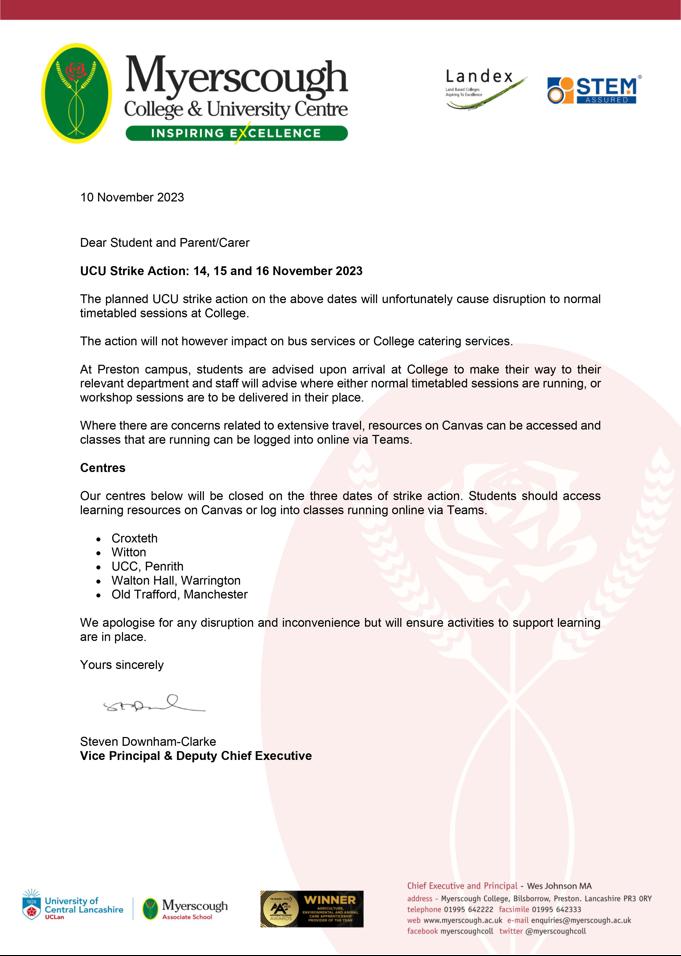 Published: Friday 10 November 2023We have been informed that staff who are members of the University and College Union (UCU) will be undertaking industrial action next week.