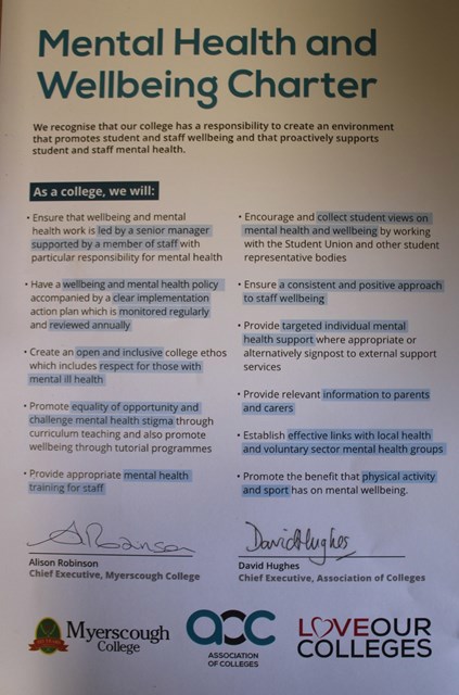 The charter, which was been created by the Association of Colleges, in conjunction with mental health experts, is an 11-point document, which includes commitments to: