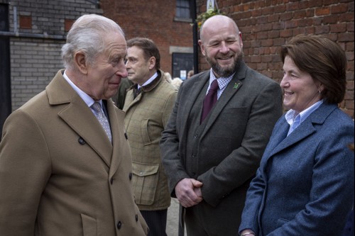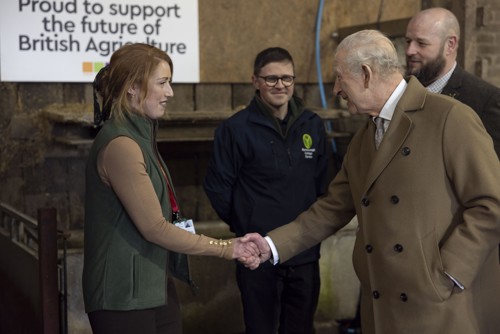 King Charles arrived at Lee Farm and was introduced to members of the Duchy of Lancaster team, before meeting Myerscough Chief Executive and Principal, Wes Johnson, and Andrea Gardner, Director of Farm Operations and Innovation.