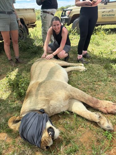 The students ‘darted’ a lioness with Dr Pierre to do an ultrasound to check for pregnancy. The students listened to the heart and discussed what medications were given and watched her recover at a safe distance.