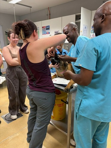 The visit began with a trip to the Society for Animals in Distress and the group got to assist with neutering of about 30 dogs. They helped catheterise, intubate, clip and recover the patients and then had a tour around their farm and equine areas.