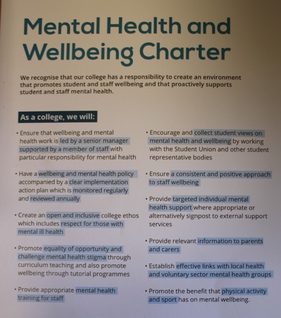 The charter, which was been created by the Association of Colleges, in conjunction with mental health experts, is an 11-point document, which includes commitments to:
