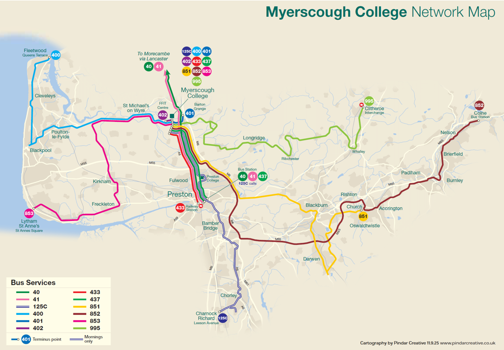 Bolton-Chorley Area: Please note that the 125C only runs in the morning and there is no direct return from Myerscough at the end of the day. The bus leaves Chorley at 07:30 and will bring students directly to campus. Returning home from Myerscough, students can use the 40/41 service (from Bilsborrow to Preston Bus Station) and connect to any 125 service throughout the day to return home.